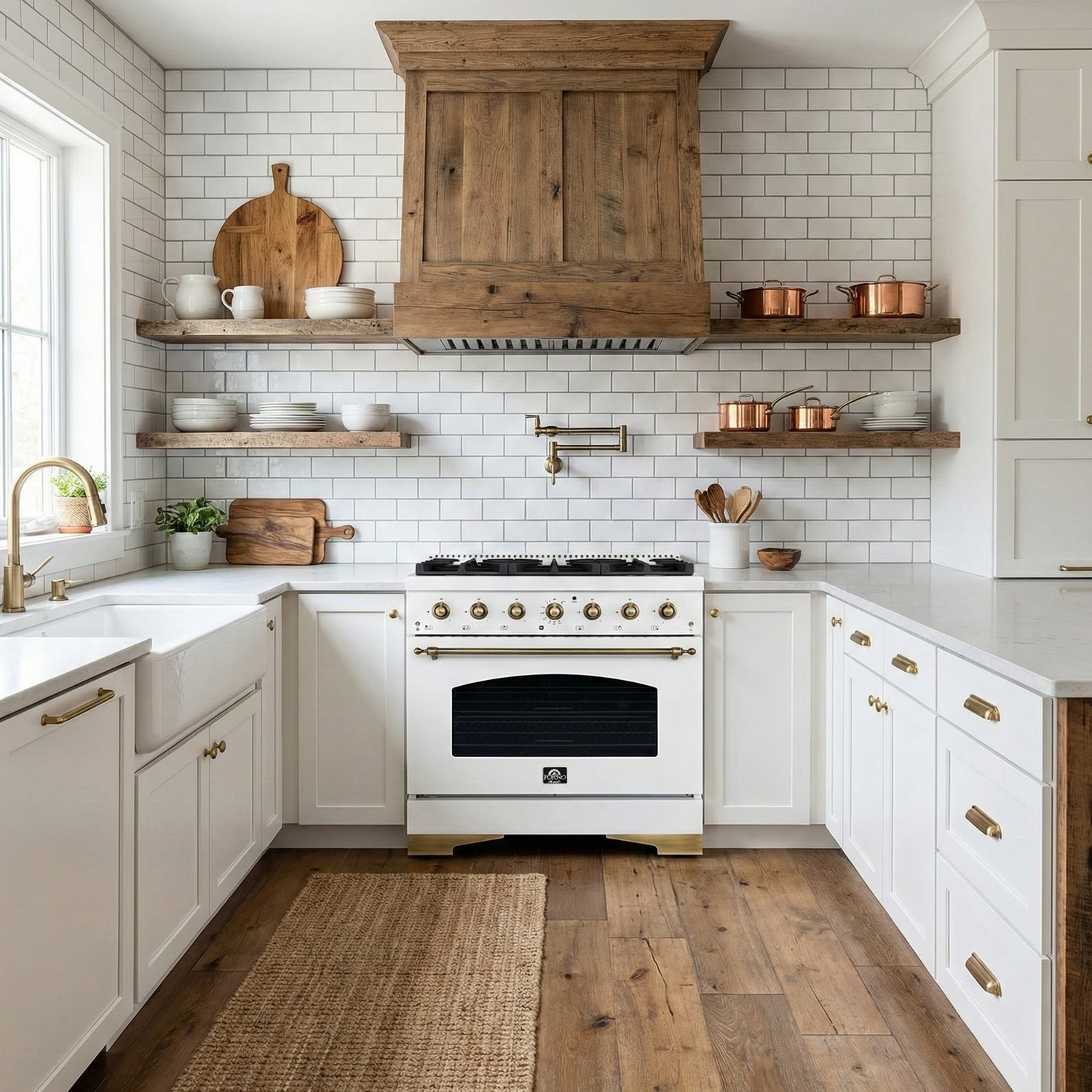 - Timeless Aesthetics: Features a sleek white finish paired with antique brass accents, along with vintage-inspired knobs and handles for a classic touch.