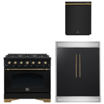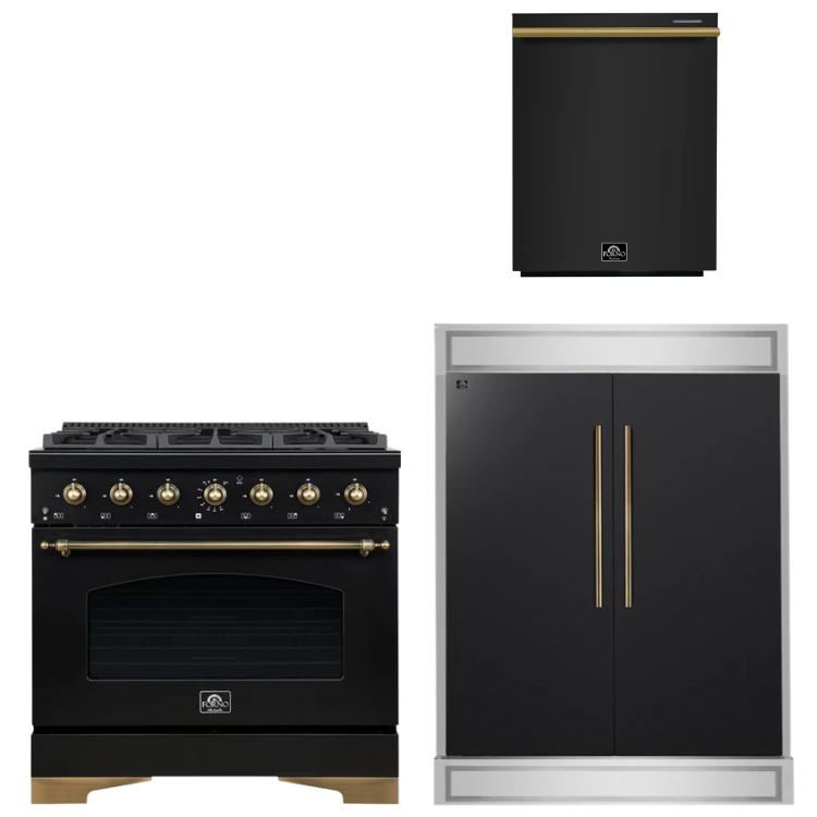 FORNO Espresso Package - 36" Gas Range, 60" Refrigerator, Dishwasher in Black with Antique Brass Accents