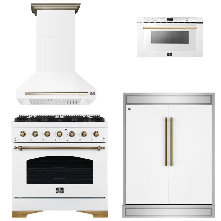 FORNO Espresso Package - 36" Gas Range, Range Hood, 60" Refrigerator, Microwave in White with Antique Brass Accents