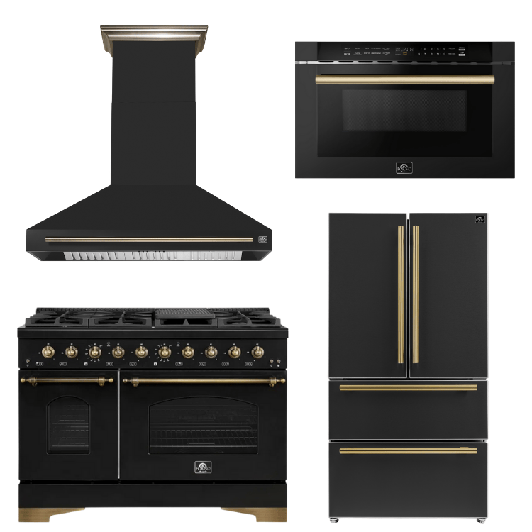 FORNO Espresso Package - 48" Dual Fuel Range, Range Hood, 36" Refrigerator, Microwave in Black with Antique Brass Accents