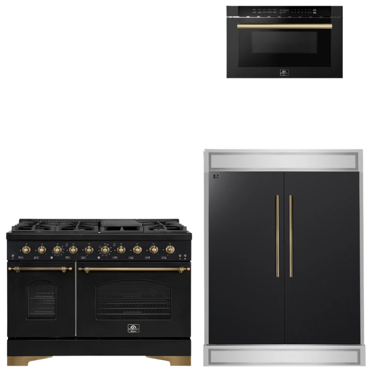 FORNO Espresso Package - 48" Gas Range, 60" Refrigerator, Microwave in Black with Antique Brass Accents
