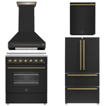FORNO Paolo Package - 30" Electric Range, Wall Mount Range Hood, 36" Refrigerator with Ice Maker and Dishwasher in Black with Antique Brass Accents, AP4-6011BLK-A15