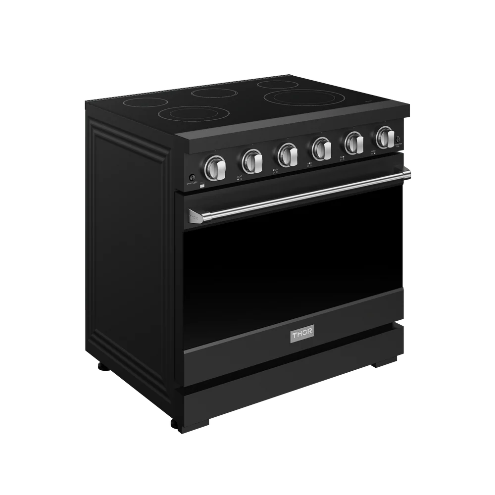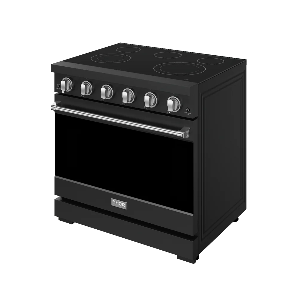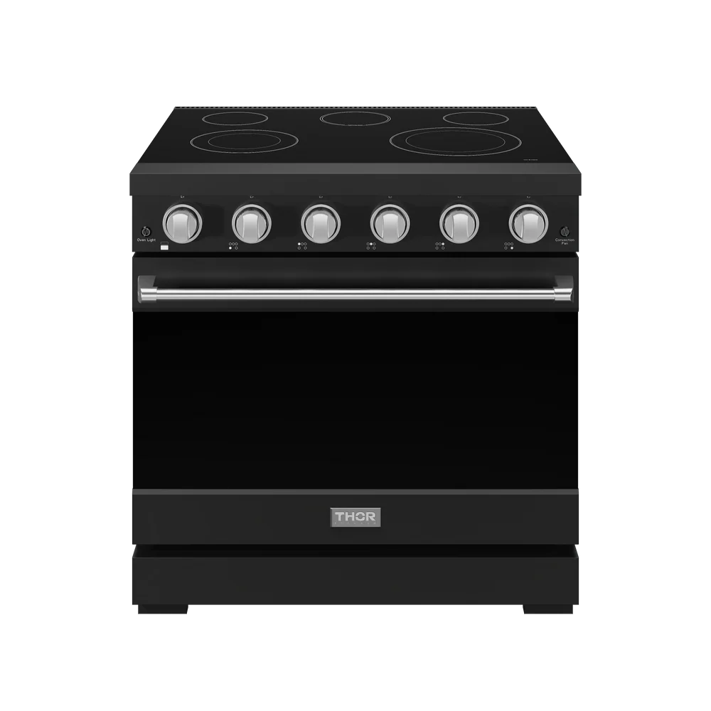 Experience professional-grade cooking at home with the Gordon Ramsay by THOR Kitchen 36" Professional Electric Range. Designed in sleek black with a durable glass-ceramic cooktop, this powerhouse features five versatile burners, a spacious 6.0 cu. ft. oven, and high-performance elements that deliver precise heat for everything from gentle simmering to intense searing. With thoughtful features like a telescopic rack, true convection, and a panoramic viewing window, this range combines style, functionality, and chef-inspired performance in one premium appliance.