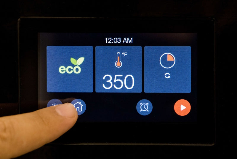 Simple touch screen, with intuitive and straightforward graphics provides easy commands for selecting thermostat, timer and automatic programmer for cooking start and finish timers.