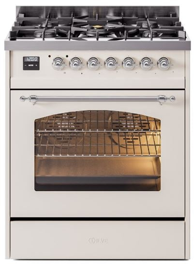 ILVE Nostalgie II 30" Dual Fuel Natural Gas Range in Antique White with Chrome Trim, UP30NMPAWC