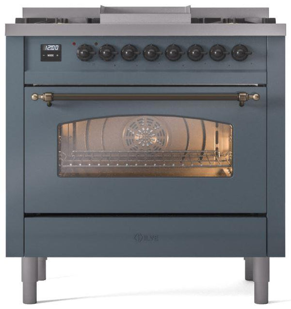 ILVE Nostalgie II 36" Dual Fuel Propane Gas Range in Blue Grey with Bronze Trim, UP36FNMPBGBLP