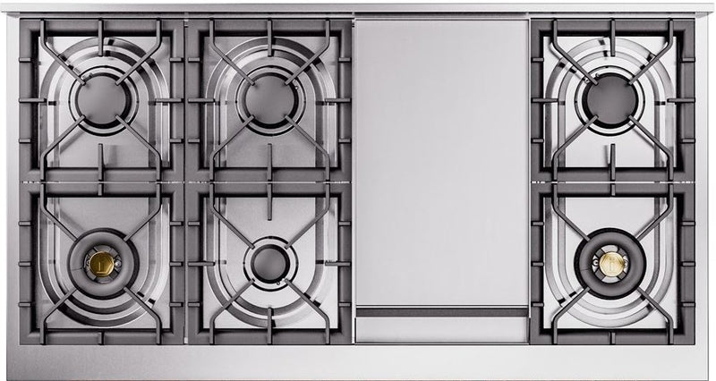 • Cooktop Features: Number of Burners - 8 // Griddle - Yes // French Top - No // Cast Iron Grates - Yes // Downdraft Ventilation - No // Control Type - Knobs