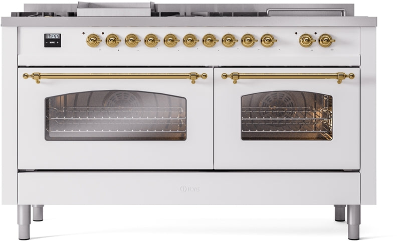ILVE Nostalgie II 60" Dual Fuel Natural Gas Range in White with Brass Trim, UP60FSNMPWHG
