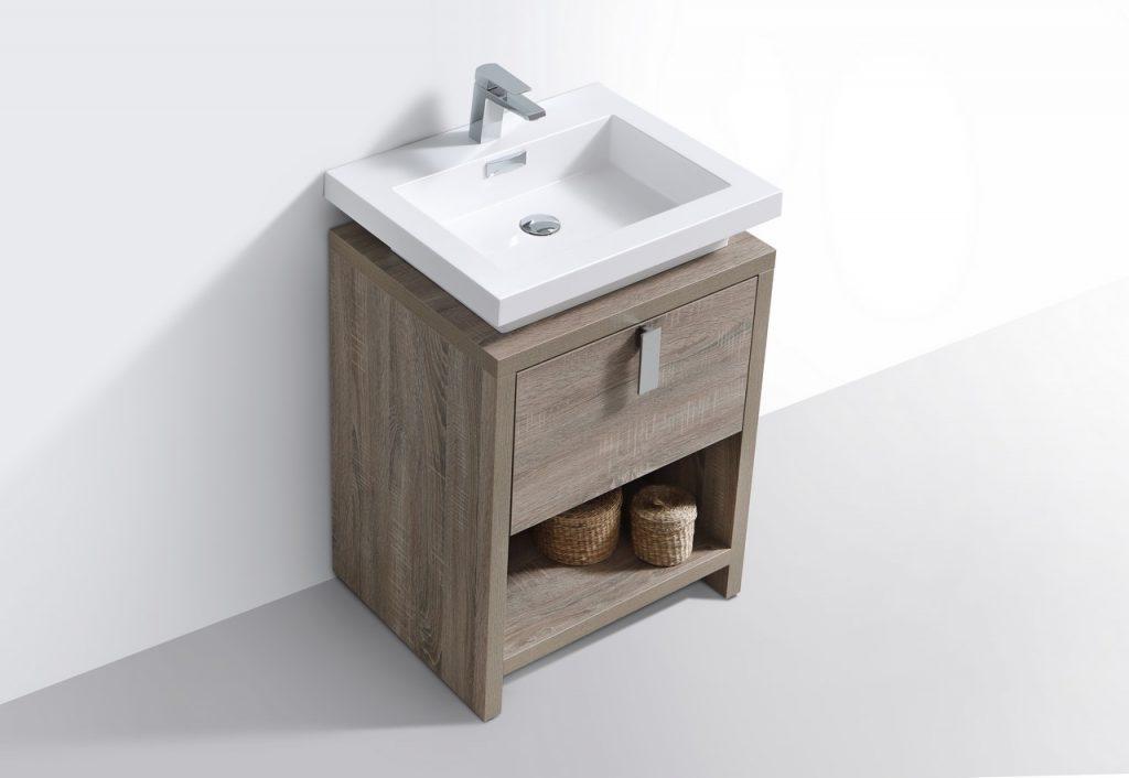 The Levi free standing bathroom vanity by KubeBath features one drawer for storing bathroom essentials. The clean, contemporary lines are enhanced by a crisp white integrated sink and a Havana Oak durable finish.