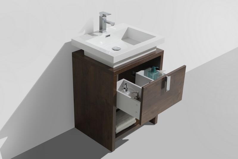The Levi free standing bathroom vanity by KubeBath features one drawer for storing bathroom essentials. The clean, contemporary lines are enhanced by a crisp white integrated sink and a Rose Wood durable finish.
