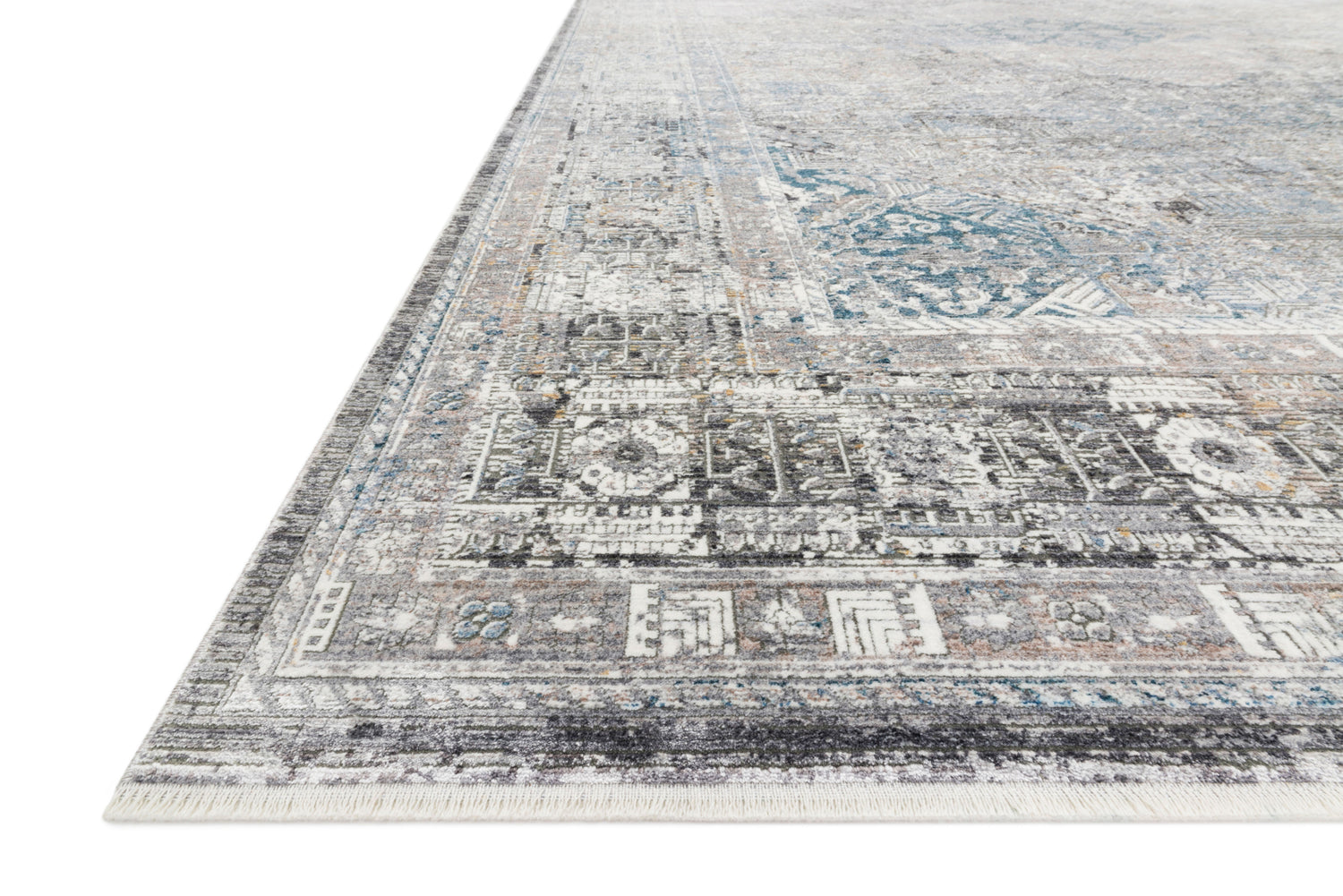 • With calming tones of charcoal, silver, and blue, this vintage floor covering provides a relaxing vibe in your living room, entryway, or bedroom.