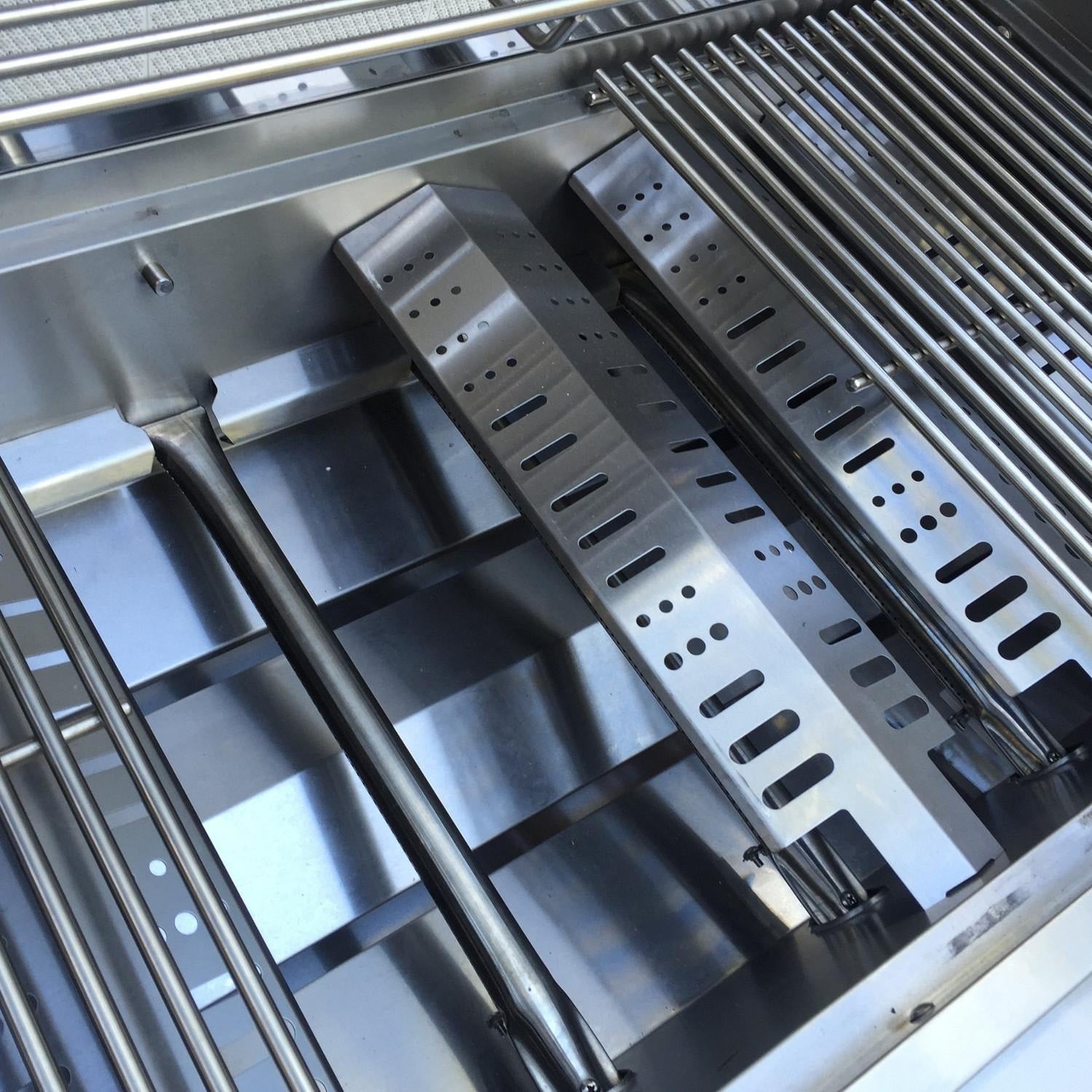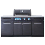 The Mont Alpi 957 5-burner Island gas grill is a prefabricated black stainless steel and black powder coated steel gas grill with modern white ganite topped side cabinets. It has a large 4 burner (63,000 BTU) grill with additional infrared rear burner. It comes fitted with halogen lights in the cooking zone to make grilling in the dark a lot easier. The knobs are fitted with on/off color changing LED lights. It has 8mm 304 stainless steel rod cooking grates and 304 heavy duty tubular high-efficiency burners. With very little assembly, you will be grilling in no time. The caster wheels allow it to be moved around. A heavy duty electric rotisserie kit and all weather heavy duty cover are all included. The grill also has large cabinets to store all your grill accessories and to hold a propane tank. The grill can run on natural gas with a small 15 min conversion that anyone can do and it will not cost you extra money. All you will need is a natural gas hose to connect to.