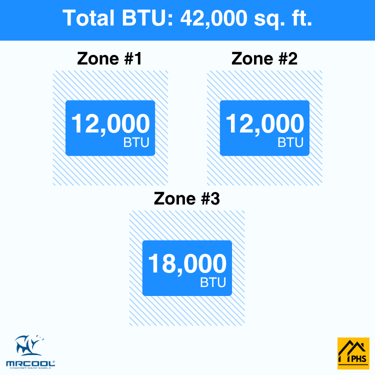 • Capacity: Total: 42,000 BTU//Zone 1: 12,000 BTU//Zone 2: 12,000 BTU//Zone 3: 18,000 BTU