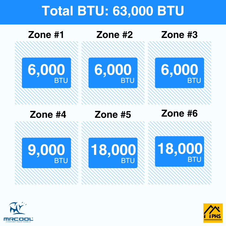 • Capacity: Total: 63,000 BTU//Zone 1: 6,000 BTU//Zone 2: 6,000 BTU//Zone 3: 6,000 BTU//Zone 4: 9,000 BTU//Zone 5: 18,000 BTU//Zone 6: 18,000 BTU