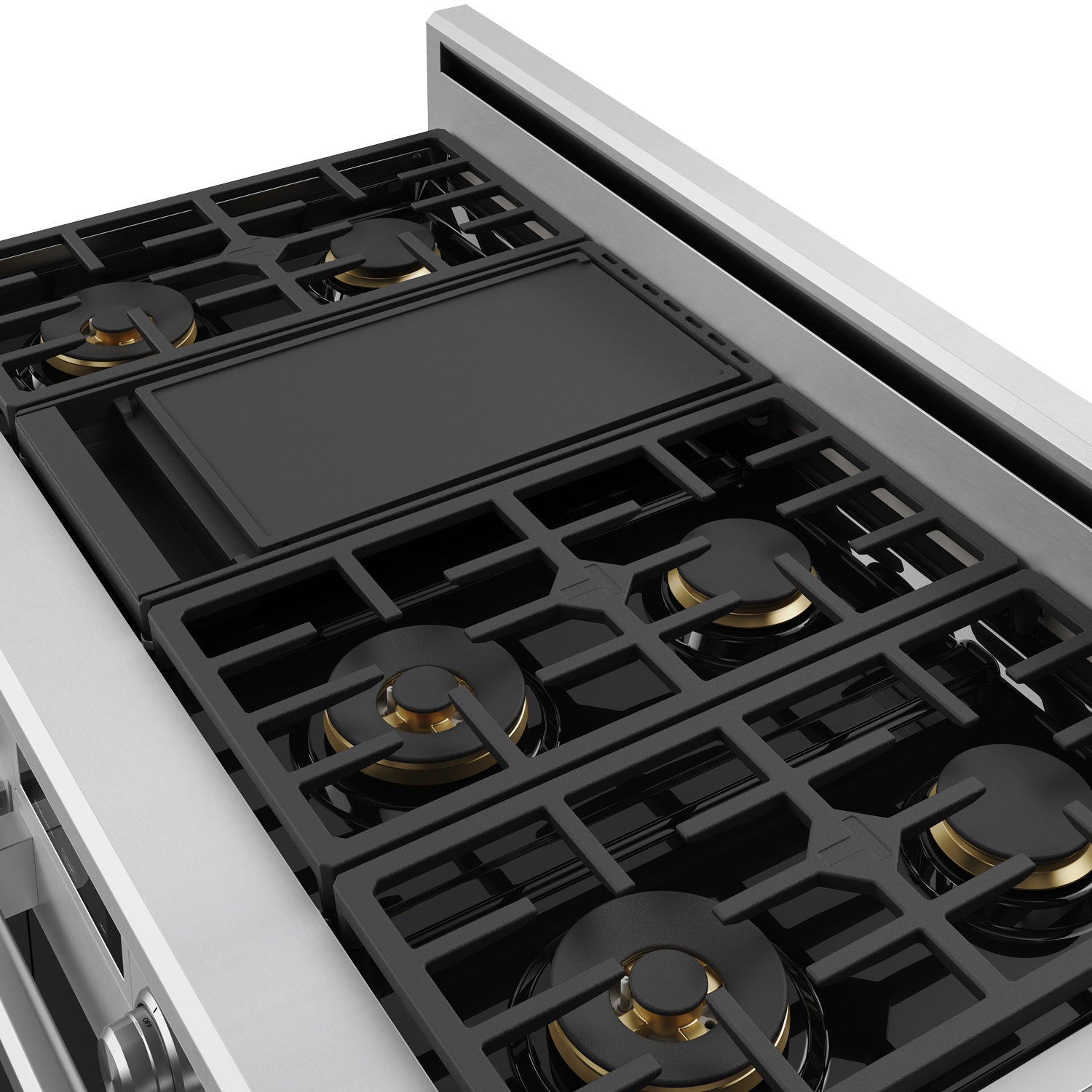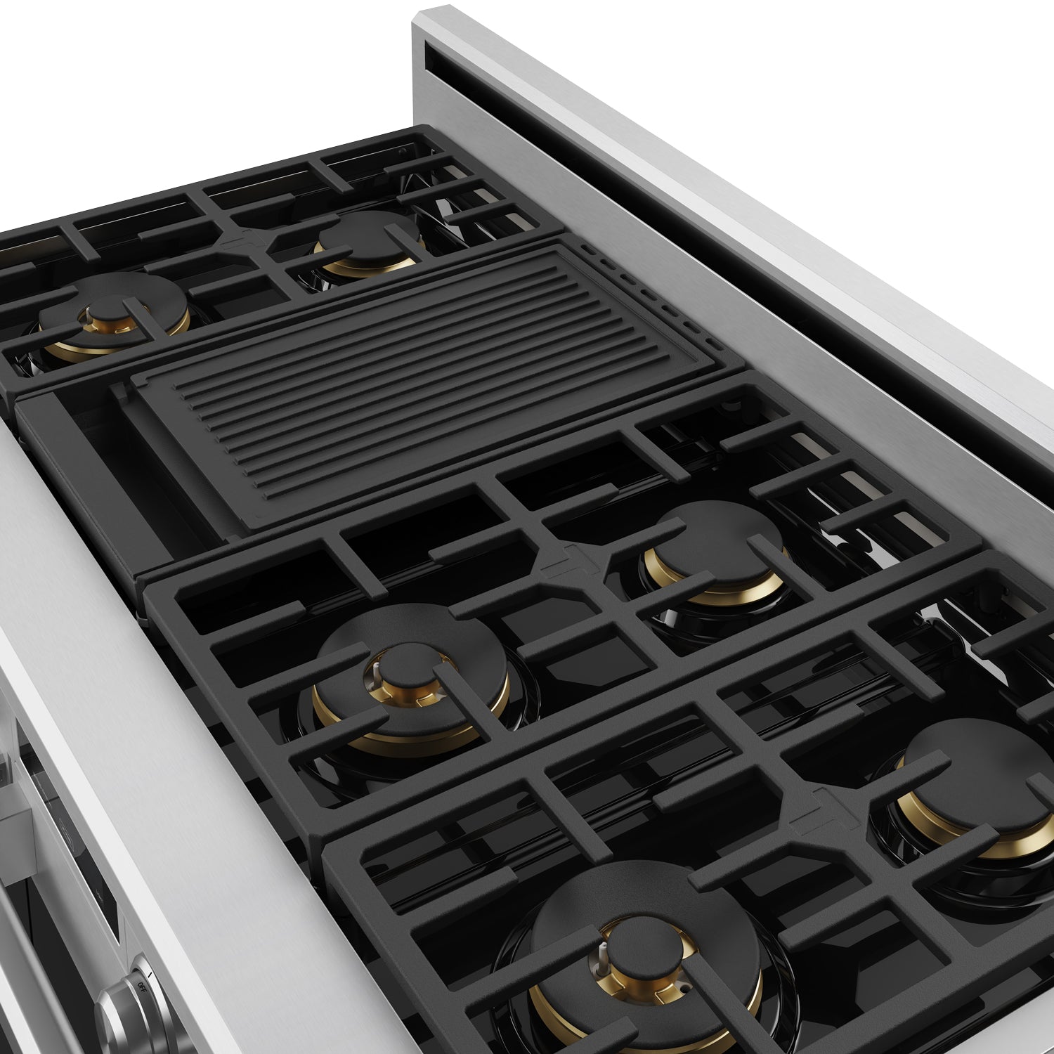 • Continuous Cast-Iron Grates: Heavy-duty, seamless surface supports easy pan movement and pro-grade durability.