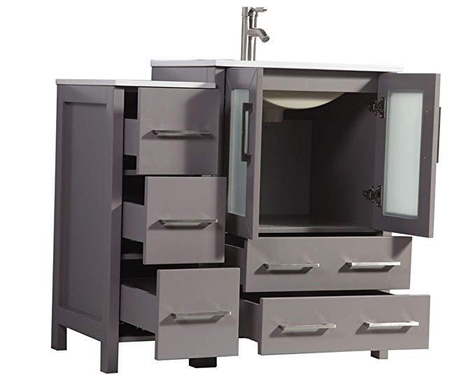 Update your bathroom with this ceramic vanity set. This set includes white ceramic top contrasts with the cabinets color. The 48 inch single sink bathroom vanity set offers an eye-catching focal point to your bathroom ensemble while increasing storage space. Boasting a solid neutral finish, this vanity set features eight drawers and three cabinets for keeping crisp towels, cleaning supplies, and other bathroom essentials. Matching framed mirror is also included.