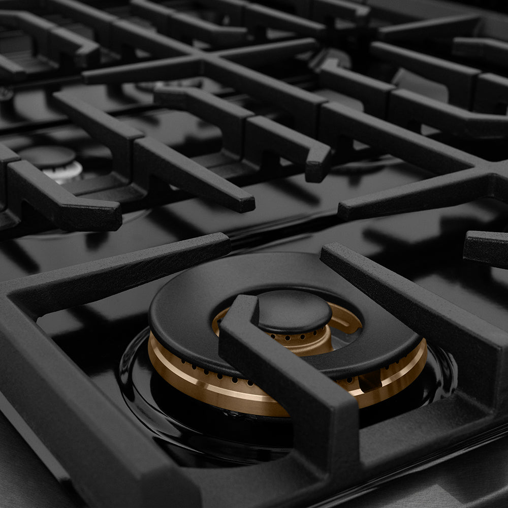 • Cast-Iron Grates: Enhanced, durable grates support steady heat transfer and steady pan movement
