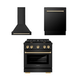 ZLINE Autograph Package - 30 In. Gas Range, Range Hood, Dishwasher in Black Stainless Steel with Gold Accent, 3AKP-RGBRHDWV30-G