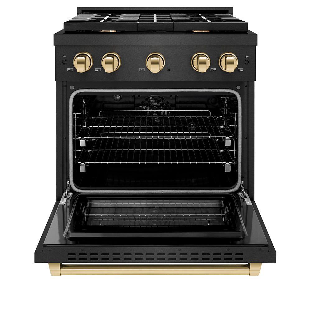 ZLINE Autograph 30" 4.2 cu. ft. Paramount Dual Fuel Range with 4 Burner Gas Cooktop in Black Satin with Gold Accents, SDRBSZ-30-G