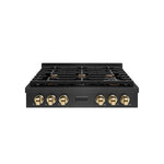 ZLINE Autograph 36" Paramount Gas Rangetop with 6 Burners and Porcelain Cooktop in Black Satin with Polished Gold Accents, SRTBSZ-36-G