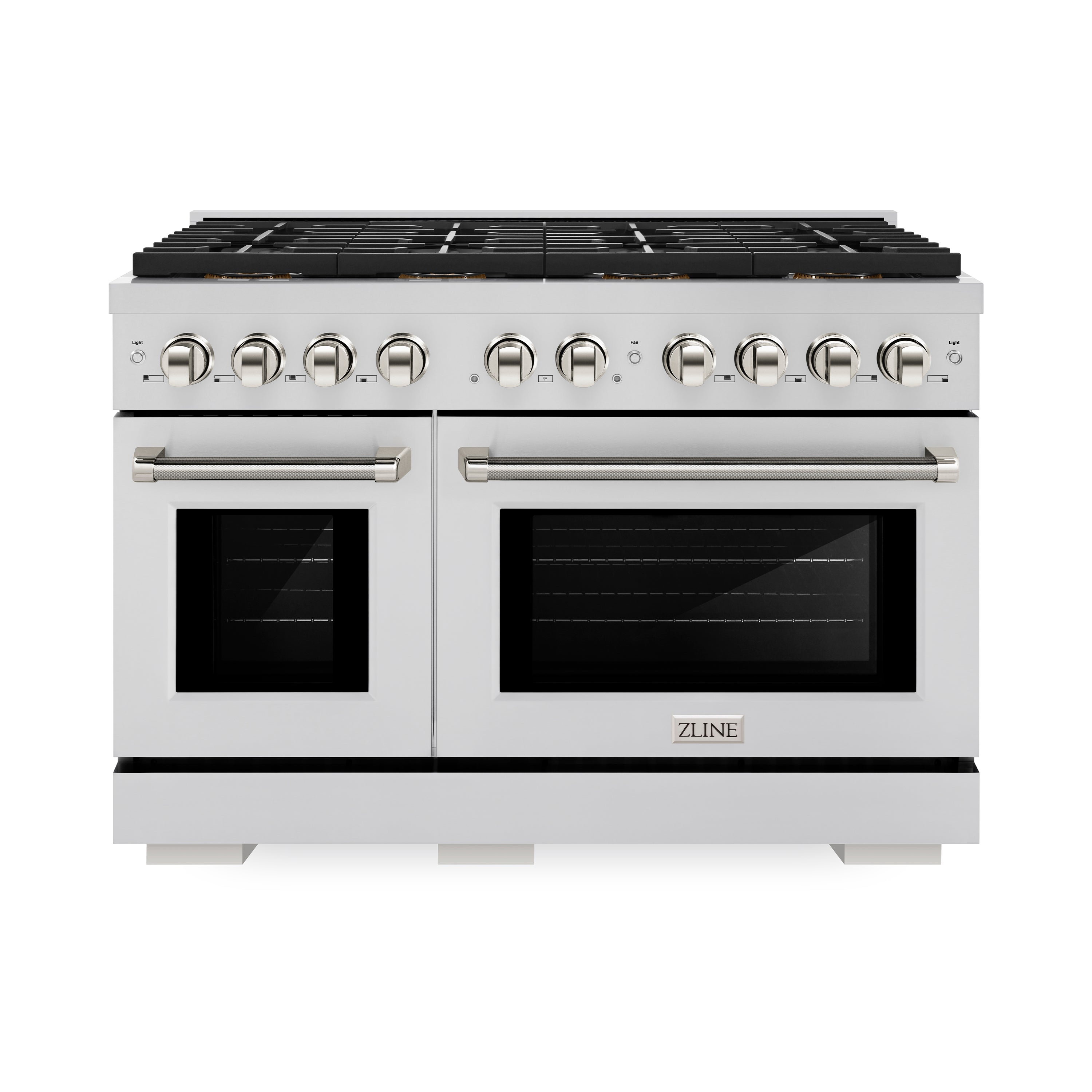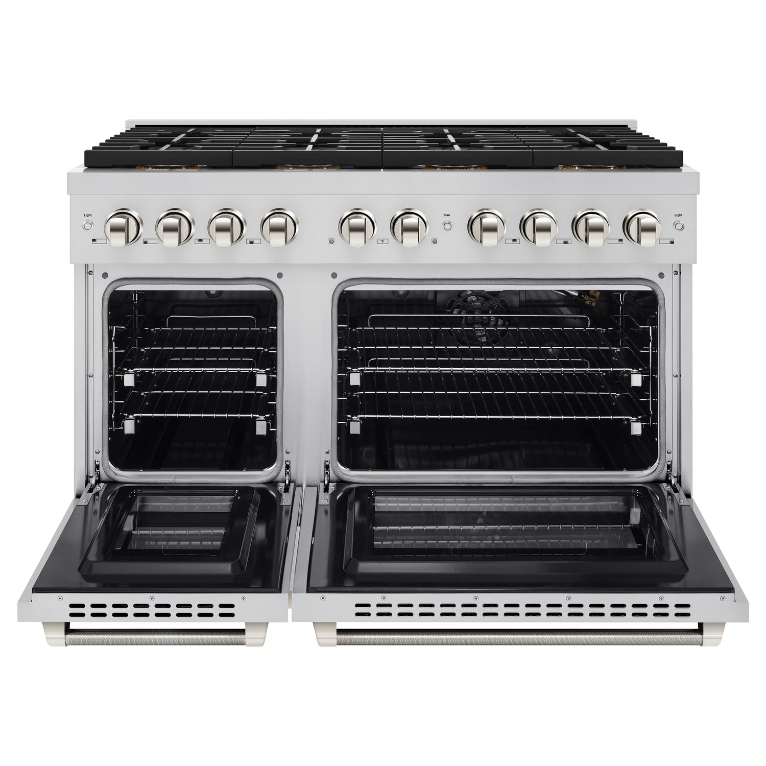 Luxury isn’t meant to be left desired—it’s meant to be attainable. The ZLINE Autograph Edition 48 in. 6.7 cu. ft. Paramount Gas Range with 8 Burner DuoPro™ Cooktop and Dual Ovens in Stainless Steel with Polished Nickel Helix Handles and Accents (PSGRZ-48-KPN) features a high-powered gas cooktop with 8 hand-crafted Italian dual-ring brass burners and a versatile gas convection oven allowing you to master every meal. With ZLINE DuoPro™, every burner brings the performance you need—wherever you need it.