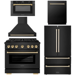 ZLINE Autograph Appliance Package - 36" Dual Fuel Range, Range Hood, 36" Refrigerator with Ice Maker, 24" Microwave Drawer and Dishwasher in Black Stainless Steel with Polished Gold Accents