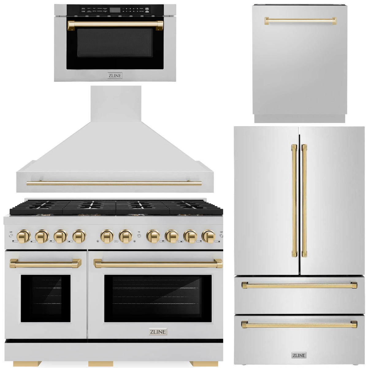 ZLINE Autograph Appliance Package - 48" Gas Range, Range Hood, 36" Refrigerator with Ice Maker, 24" Microwave Drawer and Dishwasher in Stainless Steel with Polished Gold Accents