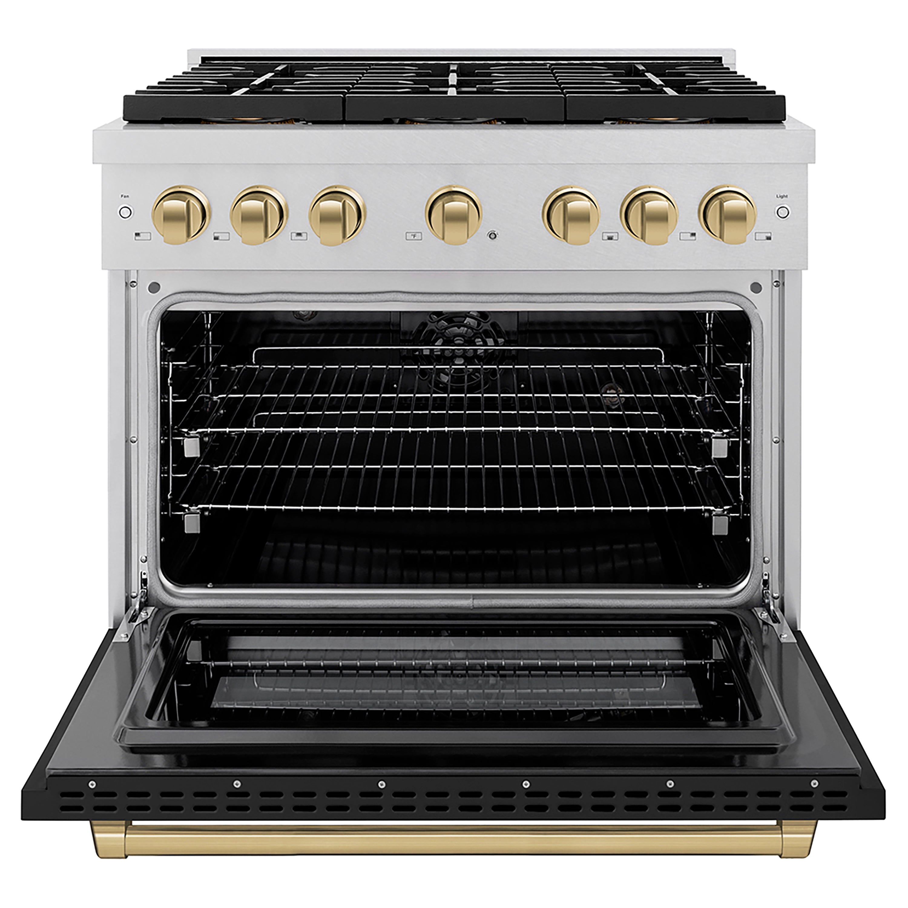 Luxury isn’t meant to be left desired—it’s meant to be attainable. The ZLINE Autograph Edition 36 in. 5.2 cu. ft. Paramount Dual Fuel Range with 6 Burner DuoPro™ Cooktop and Electric Convection Oven in Satin Stainless Steel with Black Matte Door and Champagne Bronze Accents (PSDRSZ-BLM36-CB) features a high-powered gas cooktop with 6 hand-crafted Italian dual-ring brass burners and a versatile electric convection oven allowing you to master every meal. Double your cooking power on every burner with a DuoPro™ Cooktop that delivers ultimate flame control flexibility and unprecedented culinary confidence.