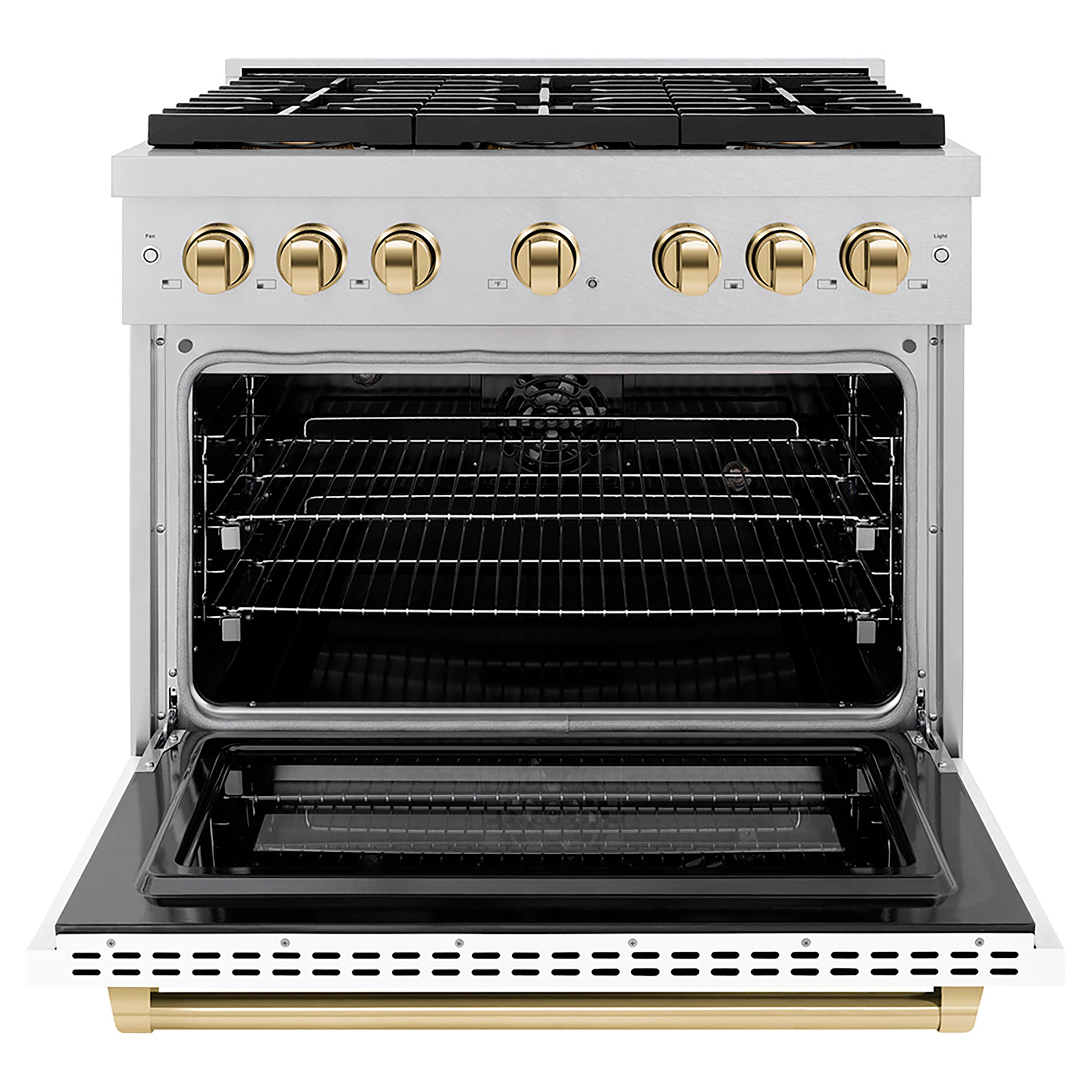 Luxury isn’t meant to be left desired—it’s meant to be attainable. The ZLINE Autograph Edition 36 in. 5.2 cu. ft. Paramount Dual Fuel Range with 6 Burner DuoPro™ Cooktop and Electric Convection Oven in Satin Stainless Steel with White Matte Door and Polished Gold Accents (PSDRSZ-WM-36-G) features a high-powered gas cooktop with 6 hand-crafted Italian dual-ring brass burners and a versatile electric convection oven allowing you to master every meal. Double your cooking power on every burner with a DuoPro™ Cooktop that delivers ultimate flame control flexibility and unprecedented culinary confidence.