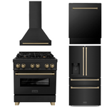 ZLINE Autograph Package - 30" Dual Fuel Range, Range Hood, Refrigerator, Dishwasher in Black with Bronze Accents