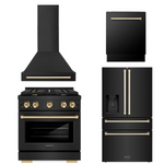 ZLINE Autograph Package - 30 In. Gas Range, Range Hood, Refrigerator with Water and Ice Dispenser, and Dishwasher in Black Stainless Steel with Gold Accents, 4AKPR-RGBRHDWV30-G