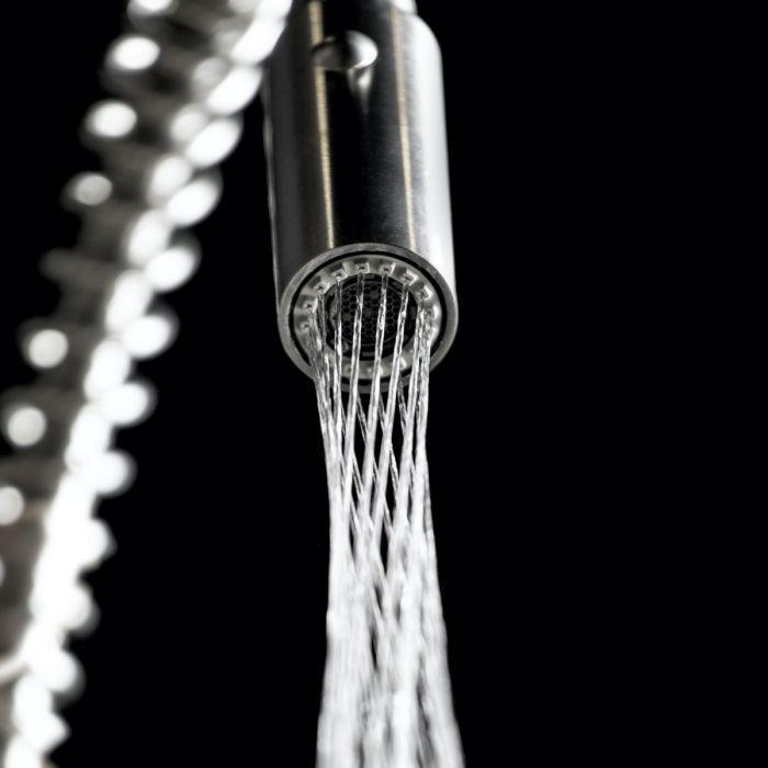 • Features a uniquely twisting lattice spray— HPAS Spray (High Pressure Anti-Splash)— which makes this faucet more powerful and effective at eliminating food and grime than a traditional sprayer.